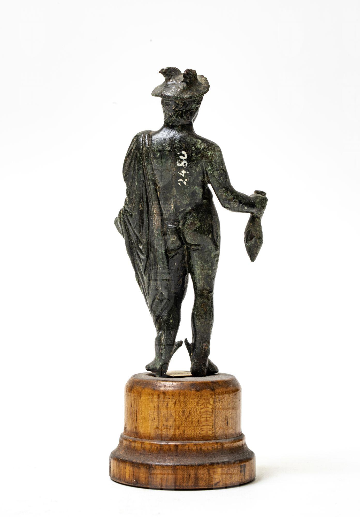 Statuetta di Mercurio seminudo: la sua "paenula" è allacciata sulla spalla sinistra ricadendo sul braccio e di lato in drappeggi. I piedi sono alati, la mano destra regge una borsa, sul capo il petaso munito di ali.