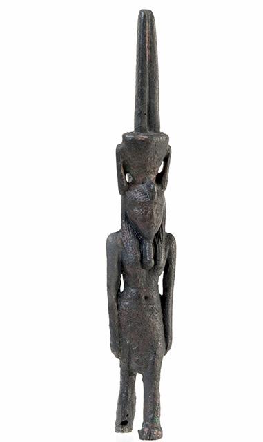 Figurina filiforme del dio Nefertum in bronzo, divinità legata al profumo ed al fiore del loto azzurro. Manca della parte inferiore delle gambe. Il dio è raffigurato nell’atto di camminare con le braccia lungo i fianchi. Indossa un corto gonnellino pieghettato (lo shendit), la parrucca tripartita con un ureo sulla fronte e la lunga barba divina. Sul capo ha il suo tipico diadema: un fiore di loto da cui spuntano due alte piume diritte. Dietro il collo si vede ciò che resta dell'anello di sospensione.