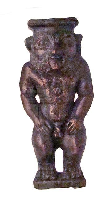 La statuetta è stata eseguita a fusione piena, utilizzando uno stampo monovalve: la parte posteriore, infatti, non è lavorata a rilievo bensì leggermente incavata. Raffigura il dio nano Bes, ritratto nudo, stante, con le braccia appoggiate sui fianchi e i piedi che poggiano su una piccola base quadrata (sotto la quale vi è un perno quadrangolare anch’esso). Al collo porta un pettorale con disco solare. Il volto è, come di norma, grottesco: sopracciglia folte e unite, naso grande e piatto, bocca aperta con la lingua a penzoloni e barba ispida. Sulla testa ha la base del suo tipico diadema, il quale doveva essere completato dalla corona di piume di struzzo, che in questo caso è assente.