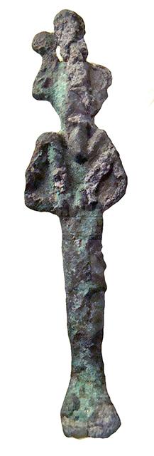 Amuleto in bronzo raffigurante il dio Osiride dal modellato molto allungato. Secondo la consueta iconografia, il dio è raffigurato stante, con il corpo mummiforme da cui escono solo le mani, che reggono scettro e flagello, e la testa, sulla quale vi è la corona atef, parzialmente spezzata. Non si distingue granché, ma al mento vi è la solita barba divina posticcia. Sotto i piedi vi è una piccola base e dietro il collo vi è un anello di sospensione.
