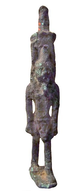 Figurina filiforme del dio Nefertum in bronzo, divinità legata al profumo ed al fiore del loto azzurro. Il dio è raffigurato nell’atto di camminare con le braccia lungo i fianchi. Indossa un corto gonnellino pieghettato (lo shendit), la parrucca tripartita con un ureo sulla fronte e la lunga barba divina. Sul capo ha il suo tipico diadema: un fiore di loto da cui spuntano due alte piume diritte, sul cui retro vi è un anello di sospensione. I piedi poggiano su una piccola base.