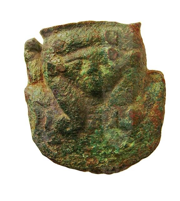 Frammento superiore di manico di sistro in bronzo, raffigurante su entrambi i lati il volto della dea Hathor, con l’ampia parrucca con fermagli e le piccole orecchie di vacca, oltre al largo collare al collo, e un ureo con disco solare che poggia sulla spalla destra. Il sistro era uno strumento musicale che, agitato, faceva vibrare delle barrette metalliche (munite o meno di sonagli) poste in un telaio, che ne costituiva appunto la parte superiore. Si tratta di uno strumento molto comune nell’antico Egitto, legato in particolare alle cerimonie religiose e attestato in vari materiali.