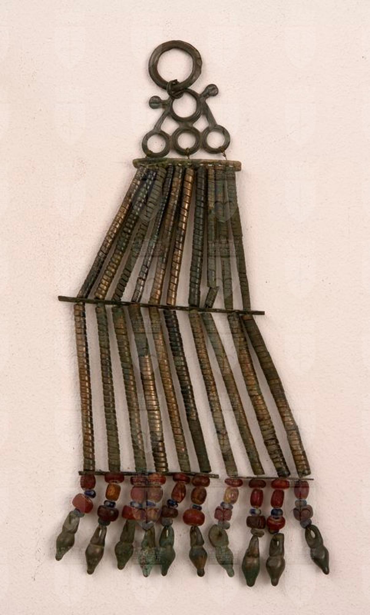 Pettorale composito costituito da un anello di sospensione e un pendente triangolare, formato da tre anelli sormontati da uno più grande con appendici laterali, di bronzo; da tre barrette in lamina bronzea di diverse dimensioni, forate, intervallate da due gruppi di dieci saltaleoni in fettuccia bronzea a più avvolgimenti; alla terza barretta sono sospese dieci serie di pendenti costituiti da due o tre vaghi di ambra e due di pasta vitrea,alternati; ciascuna termina con un pendente bronzeo a forma di secchiello.