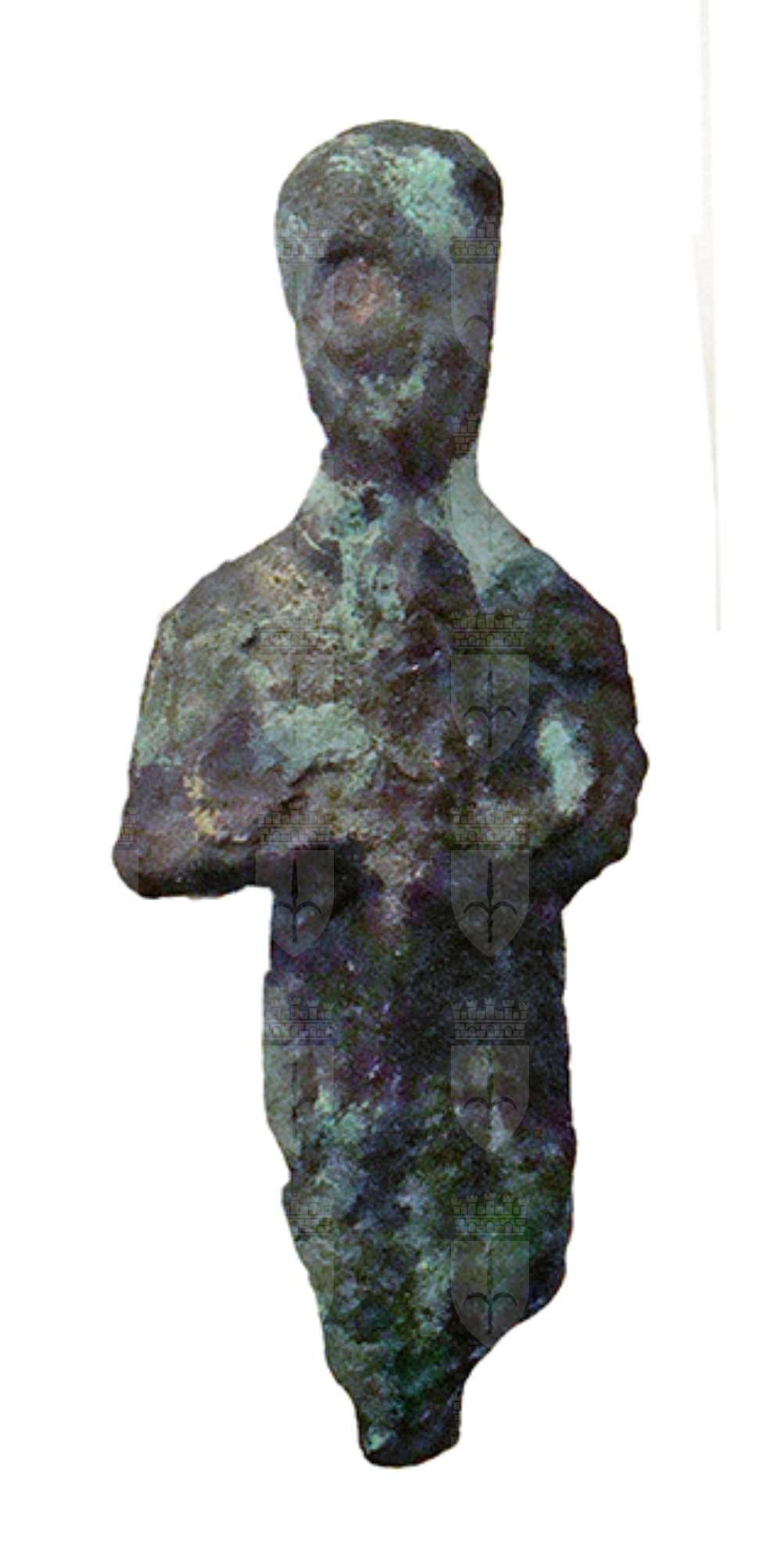 La statuina, molto rovinata e mancante delle gambe a partire dal ginocchio, raffigura il dio creatore di Menfi avvolto strettamente nel lenzuolo funebre. Sul capo la calotta, al mento la barba divina (in questo caso appena accennata). Con le mani, che spuntano fuori dal lenzuolo, regge il lungo scettro uas.