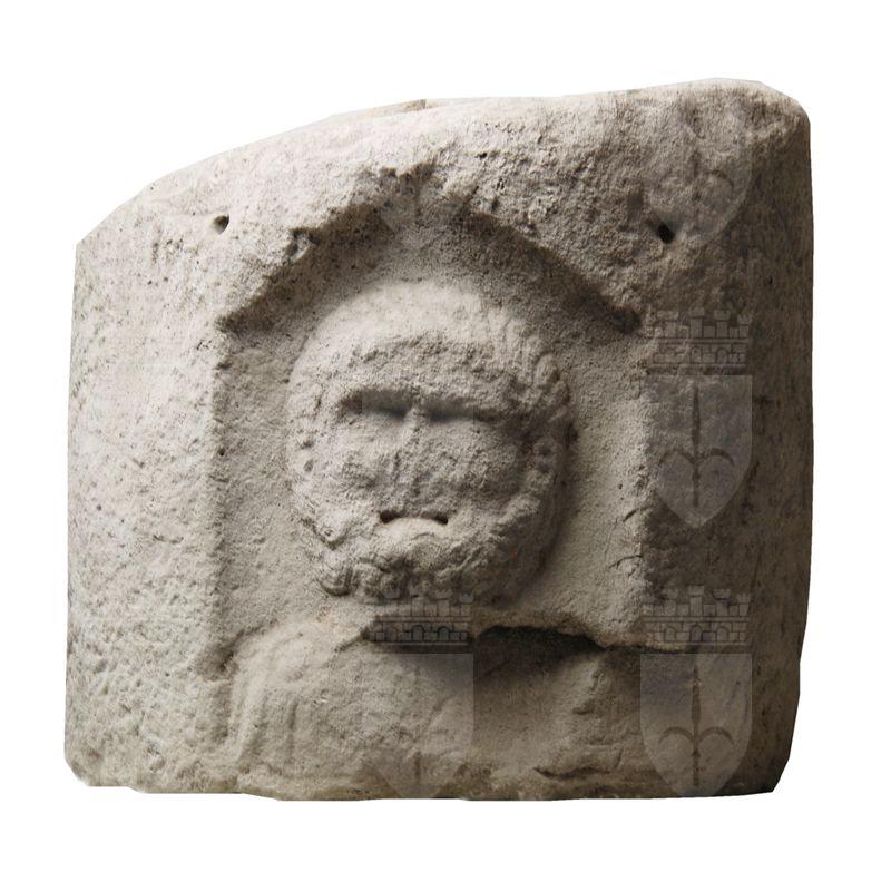 Il blocco, appena sbozzato, mostra un rilievo di esecuzione piuttosto grossolana raffigurante una testa barbuta riferibile probabilmente a Ercole.