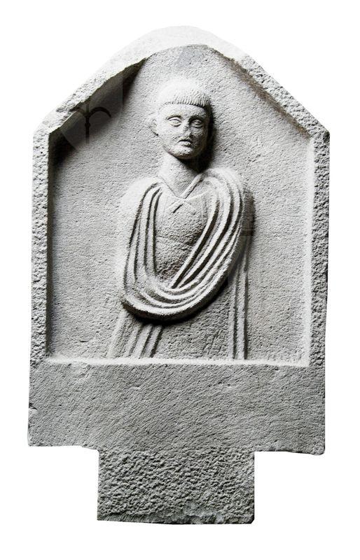 Stele centinata in calcare, con dente del fissaggio del monumento. Entro un riquadro, anch'esso centinato, è realizzato a rilievo un ritratto maschile a mezza figura con tunica e toga con drappeggio "a matassa".