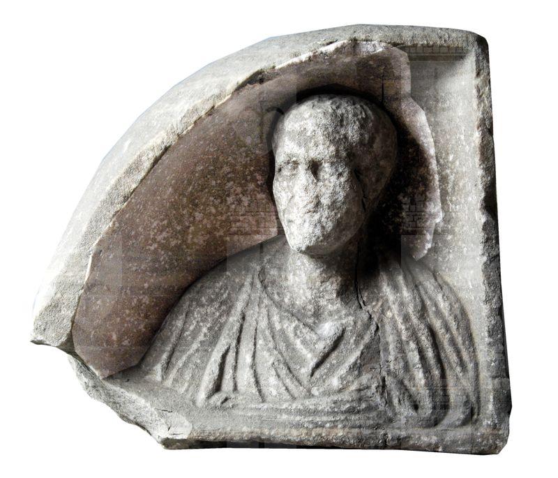Angolo di coperchio a tetto di sarcofago a forma di acroterio con busto maschile che indossa tunica e mantello.