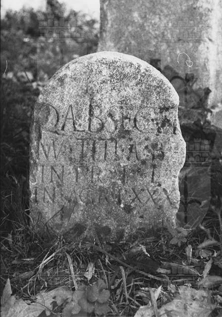 Stele liscia centinata con iscrizione latina che riporta i nomi di Q. Albio Secondo e di M. Tito Albino e le dimensioni riservate al luogo del monumento.