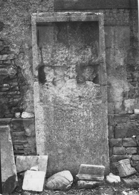 Stele rettangolare a registri sovrapposti, incorniciata da largo listello sui quattro lati: la parte inferiore è occupata dall'iscrizione, la parte superiore ospita due nicchie rettangolari a fondo piano Dedicata da C. Voltidus Fuscus al padre, alla madre, al fratello e alla moglie.