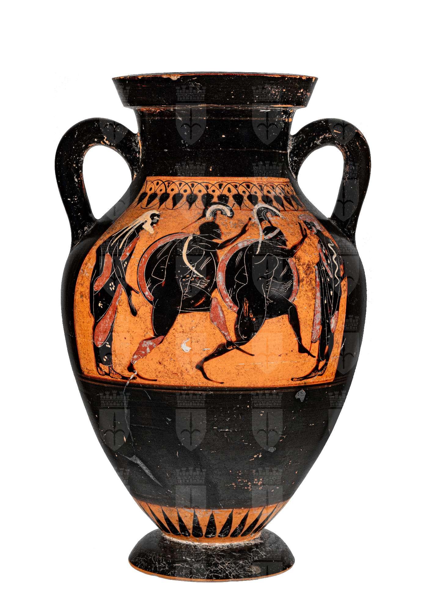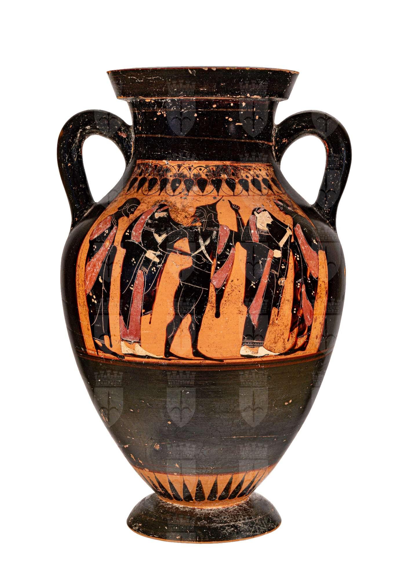 Anfora a figure nere con colori aggiunti e graffito. Lato A: La scena si compone di un uomo barbato stante e due coppie di personaggi in partenza: le due donne sono stanti, dal capo coperto dal mantello mentre uno degli uomini ha berretto a punta di foggia scitica, l’altro dall’aspetto robusto ha tenia nei capelli. Lato B: Un Anziano incoraggia gli atleti impegnati nella gara della corsa armata: sono nudi e indossano gli schinieri e l’elmo corinzio con alto lophos, portano lo scudo rotondo; chiude la scena un altro spettatore più giovane. Sotto la base sono dipinte in rosso due lettere in legamento: CE