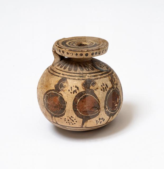 Aryballos corinzio con cinque guerrieri armati di scudo ed elmo (opliti) che procedono verso destra, tra rosette.