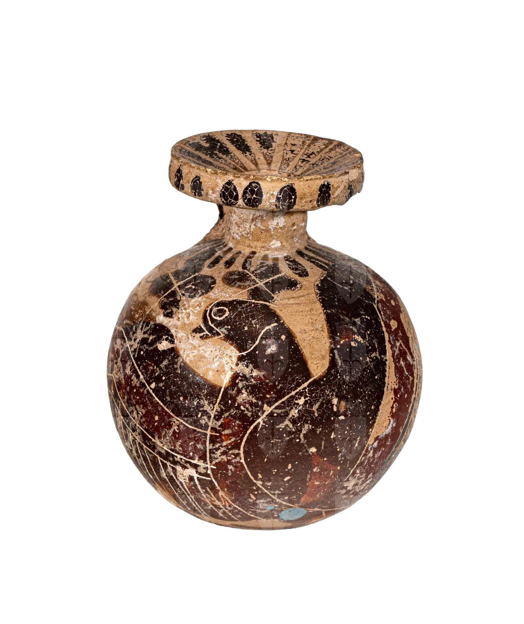 Aryballos corinzio con uccello verso sinistra, forse un gallo ad ali spiegate; nel campo rosette, sul fondo raggiera di petali.