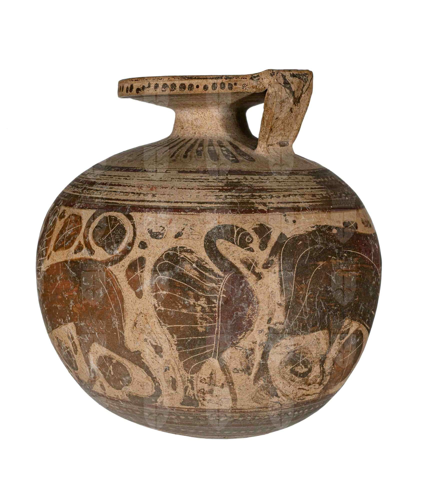 Aryballos etrusco-corinzio con ansa piatta e immagine di due sfingi a testa maschile con barba, affrontate con in mezzo un cigno; stambecco pascente e rosette. Superiormente e inferiormente decorazione a fasce di colore diverso alternate e puntini gialli. Base, spalle e labbro espanso con baccellatura.