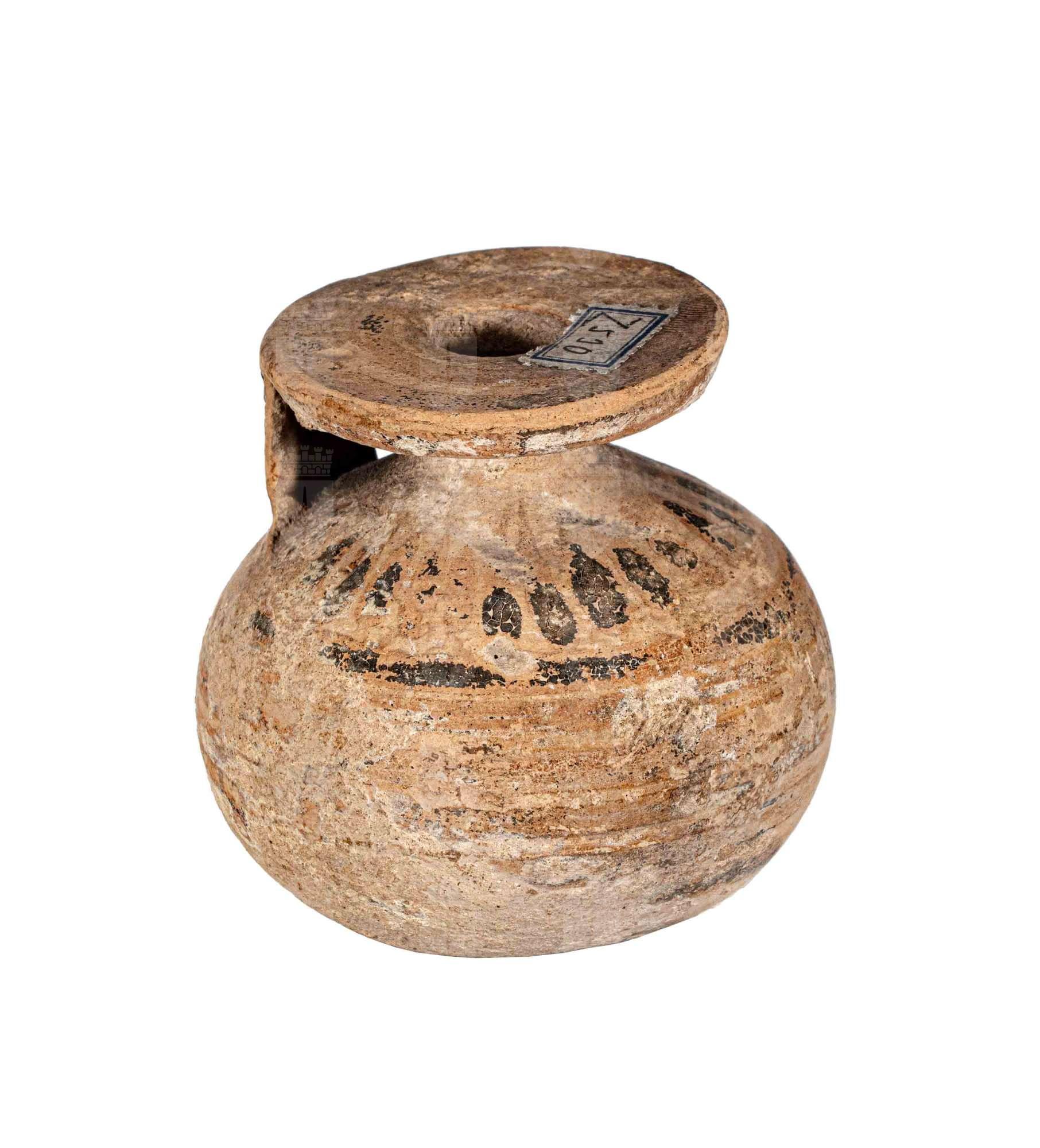 Aryballos corinzio a fasce brune, tratti verticali sulla spalla.