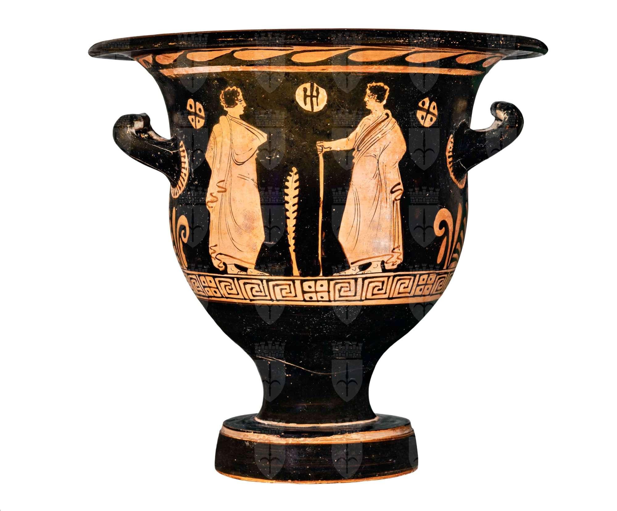 Catere a campana apulo a figure rosse. Lato A: giovane nudo in piedi con tirso e patera, altro giovane nudo seduto con tirso. Lato B: due giovani ammantati di cui uno con bastone.
