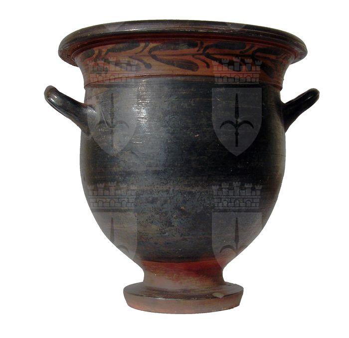 cratere a campana nero a corpo allungato; decorazione con ramo d'ulivo sotto l'orlo nero su fascia rossa