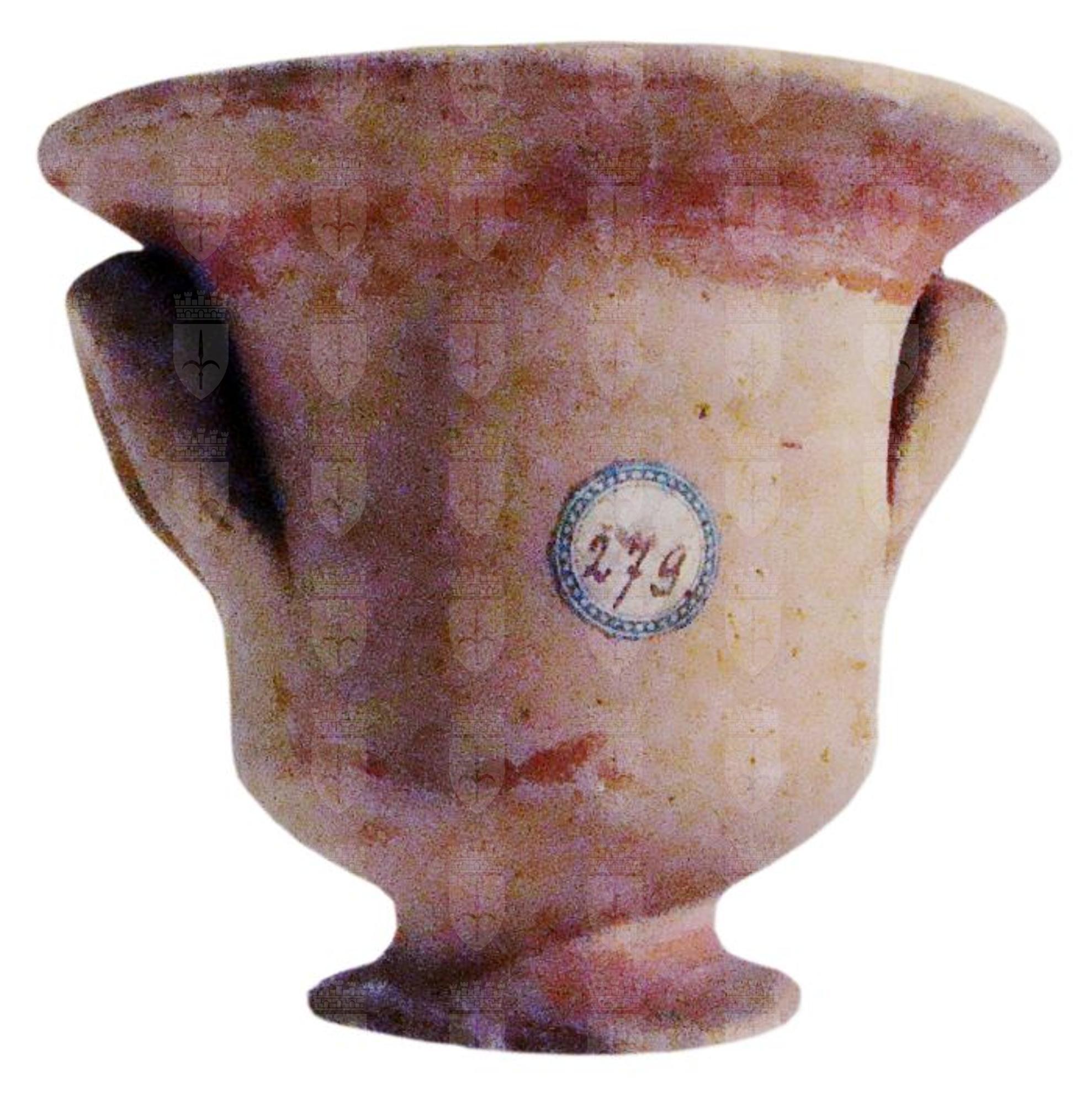 Cratere a campana miniaturistico. Orlo svasato, anse verticali impostate sul ventre, piede ad anello con basso stelo. Decorazione in vernice rosso-arancio di cui rimangono labili tracce in più punti.