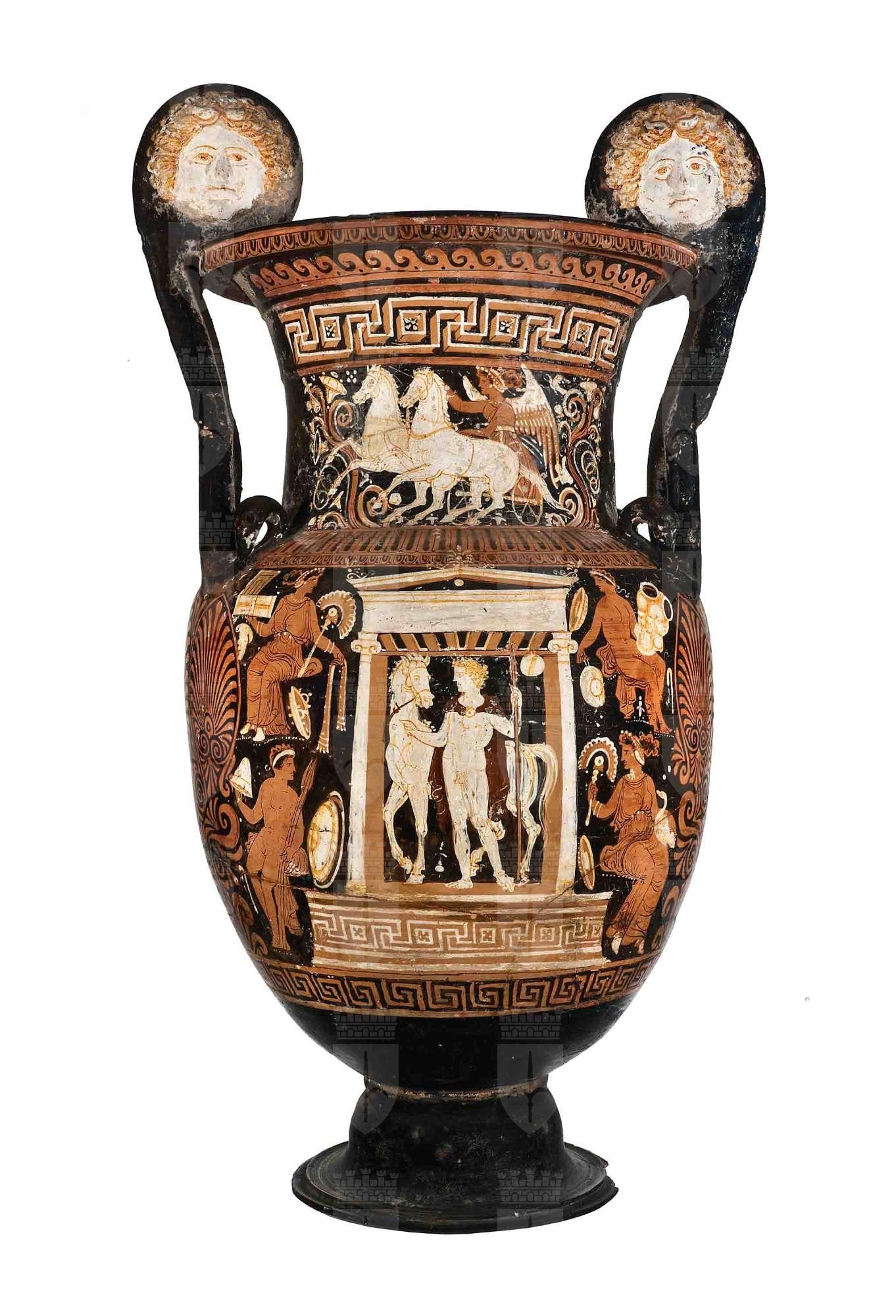 Cratere a volute con mascheroni con anse terminanti a teste di cigno; apulo a figure rosse. Lato A: defunto eroicizzato: su un basamento modanato, in un'edicola frontale, sta un giovane guerriero stante e tiene alla briglia un cavallo; ai lati quattro offerenti seduti rivolti al centro. Lato B: al centro un'edicola contenente due fiori campanulati sovrapposti e palmetta; ai lati quattro offerenti seduti.