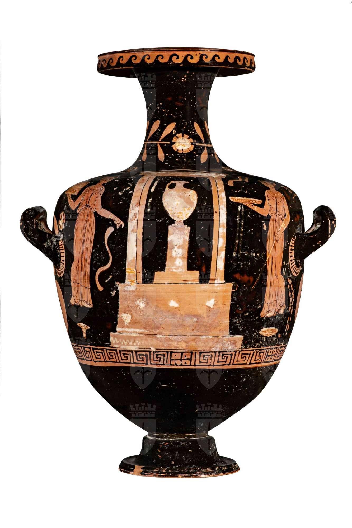 Kalpis apula a figure rosse con scena di offerta presso un tempietto: due donne in atto di offerta presso un tempietto al cui centro vi è, su un pilastro, un'hydria.