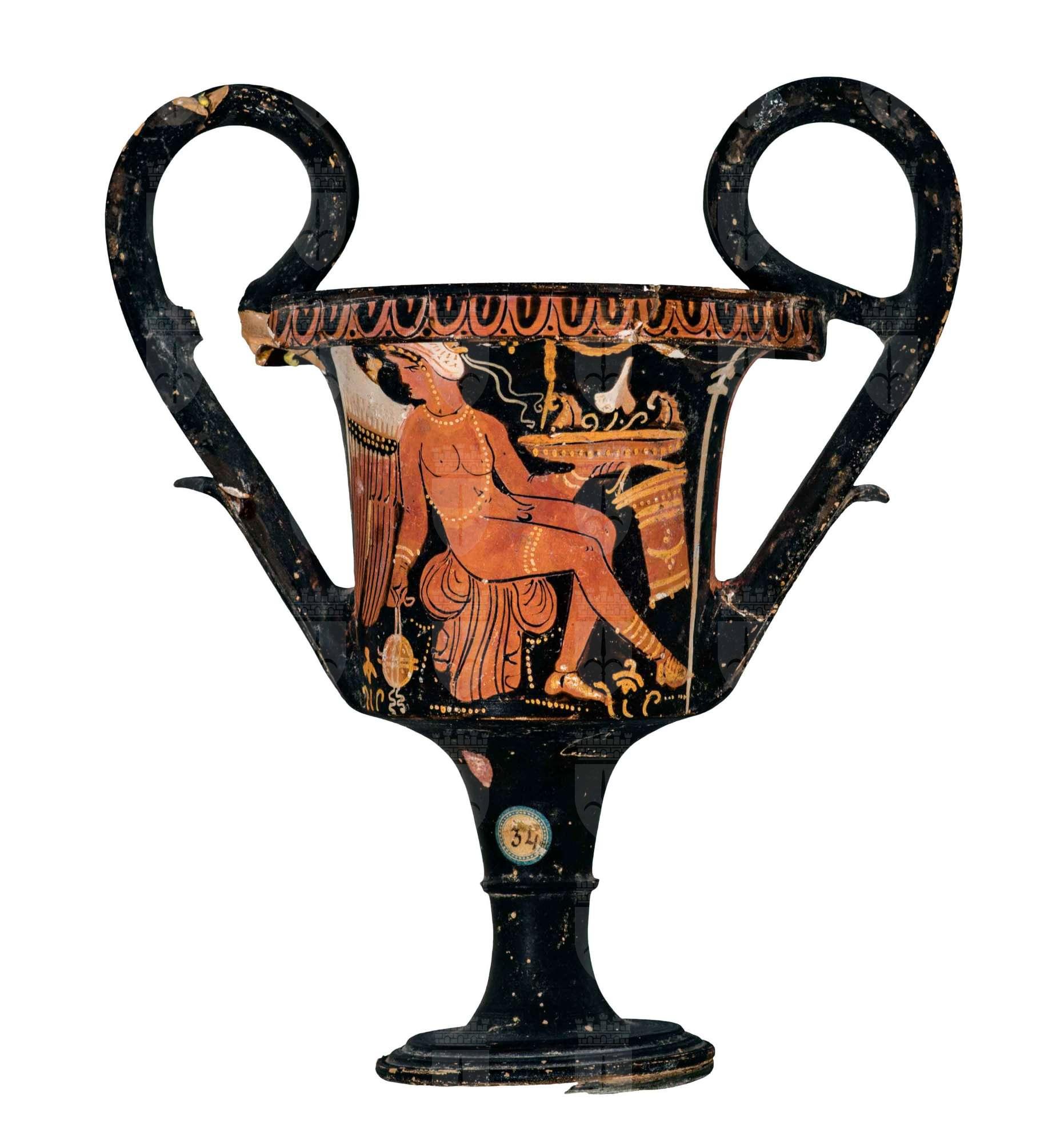 Orlo svasato con labbro revoluto; bicchiere a profilo leggermente concavo; Lato A: erote seduto con phialè e situla tra due colonne Erote seduto su drappo di tre quarti verso destra e retrospiciente. Regge nella destra un piccolo tympanon pendente da nastri sovradipinti e decorato con doppia croce sovradipinta in bianco e giallo. Nella sinistra tiene una situla profilata in giallo con decorazioni lineari e puntinate sovradipinte; sempre nella s. patera profilata in giallo sovradipinto con corona di tratti centrale. Sulla patera, offerte vegetali: foglia d’edera nella metà s. sovradipinta in bianco tra coppia di foglie spiraliformi con linea mediana in nero e puntinata in giallo. Numerose decorazioni sovradipinte: porta i capelli raccolti in un sakkòs campito in bianco con nastri e decorazioni in giallo; sulla fronte fila di vaghi in giallo, pendente oltre l’orecchio. Le ali campite superiormente in bianco sono decorate nella parte inferiore da una fascia in nero con puntini in giallo e da una serie di linee diritte. Armillae ai polsi, collana a due file di vaghi circolari – uno girocollo, l'altro a tracolla e ricadente sul petto – e decorazioni sulle embades ai piedi, tutte in giallo sovradipinto. Ambientano la scena due sottili colonne sovradipinte in bianco. Nel campo, in alto, benda sovradipinta con nastro pendente in giallo; linea di terra puntinata in giallo con due fiori sovradipinti a tre petali e a campanula. Lato B: giovane seduto con cista tra due colonne Figura maschile di tre quarti verso destra, retrospiciente, seduto su drappo con pieghe in vernice nera diluita. Il giovane, nudo, porta sul capo una corona con nastri in giallo; allacciato al collo e ricadente dietro alle spalle, un petaso campito in giallo e, ai piedi, delle embades altrettanto sovradipinte. Nella mano destra regge una cista con offerte vegetali sulla sommità e decorata con sovradipinture su più registri, con motivi lineari, a meandri e a ߵsʼ;Nella sinistra tiene un piccolo tympanon pendente e decorato con doppia croce sovradipinta in bianco e puntini e con nastri sovradipinti all’estremità. Nella d. stringe il manico di una situla con decorazioni lineari e puntinate in giallo. In appoggio all’avambraccio d. tirso con fusto in bianco (in parte evanido) e con coronamento radiale. Linea di terra puntinata in giallo. Ambientano la scena due sottili colonne sovradipinte in bianco. Nel campo, in alto, in giallo sovradipinto piccola rosetta e infiorescenza a tre punti.