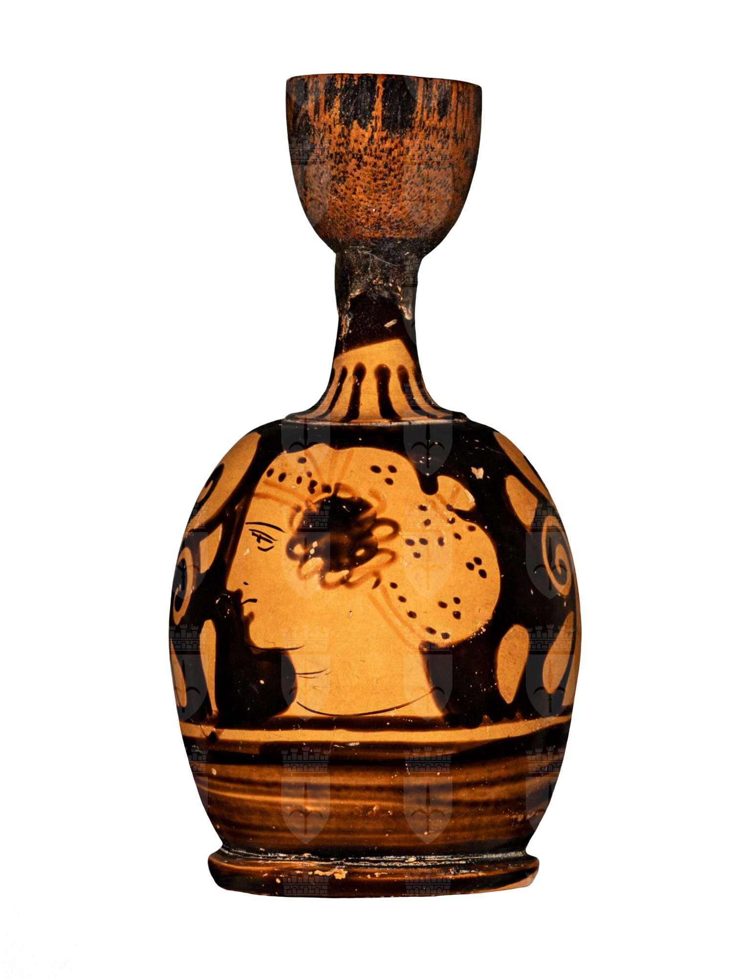 Collo affusolato distinto dalle spalle orizzontali da un sottile cavetto; corpo globulare La parte inferiore del collo decorata con corona di linguette a vernice nera entro fascia risparmiata. Sui lati, elementi vegetali con coppia di foglie. Lato A: testa femminile di profilo con sakkòs. Testa femminile di profilo, rivolta verso sinistra. L’occhio è reso con sopracciglio, palpebra, rima inferiore e superiore non coincidenti e pupilla pendente dalla rima superiore; la narice è definita da un brevissimo tratto a vernice nera; labbro superiore e inferiore distinti da un sottile tratto leggermente curvato verso il basso. Due sottili linee nere, leggermente ricurve verso l’alto, a metà collo circa; poco più in basso, girocollo costituito da un unico filo a vernice nera. I capelli acconciati e racchiusi in un sakkòs, decorato con file e gruppi di tre punti in nero e bordato da linee continue a vernice nera molto diluita; all’altezza dell’orecchio, fuoriesce dal sakkòs una ciocca di capelli ricci.