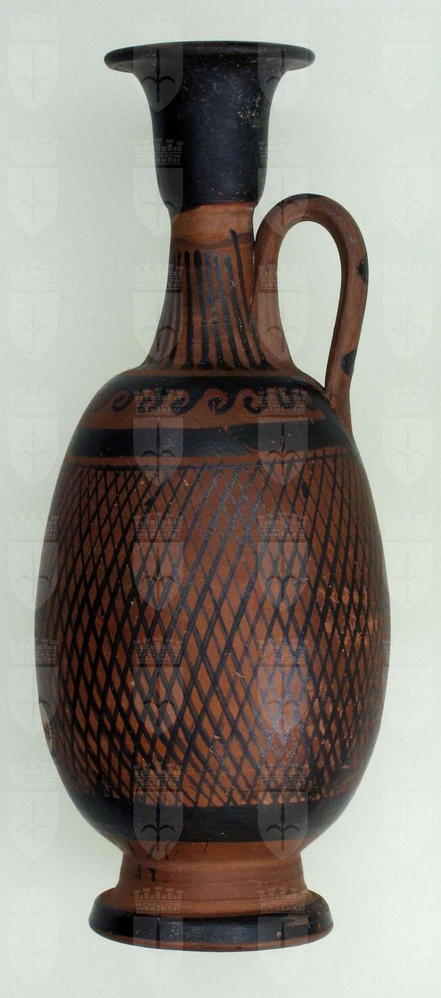 Lekythos apula con decorazione a reticolato nero e onda corrente sul collo.