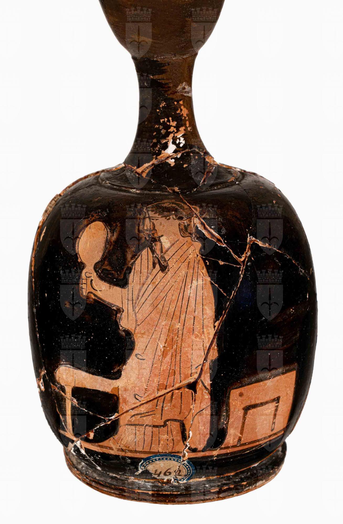 Lekythos attica a figure rosse con imboccatura troncoconica e corpo ovoidale. Donna stante con specchio. A destra, una pyxis chiusa, a sinistra un sedile a cuscino.