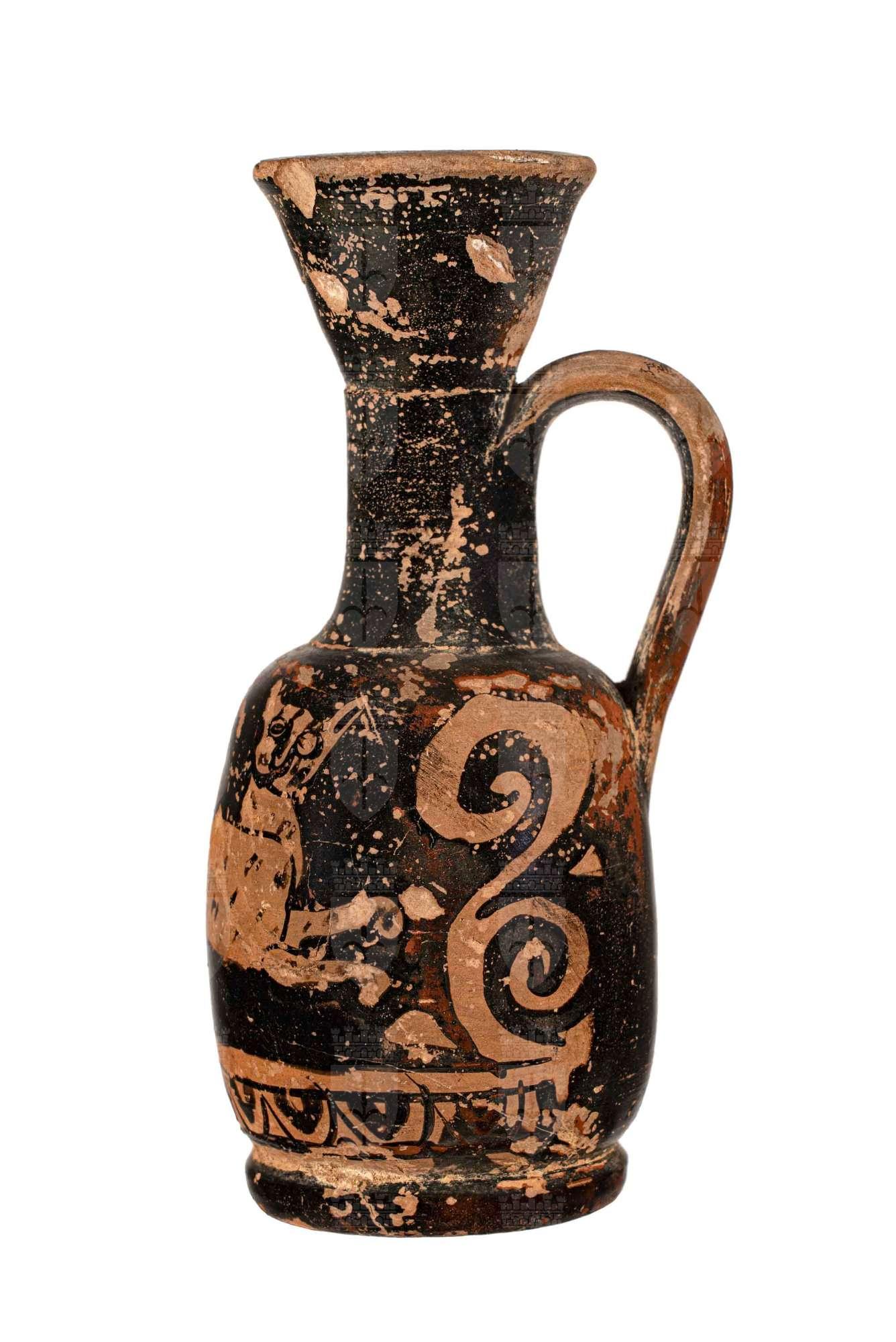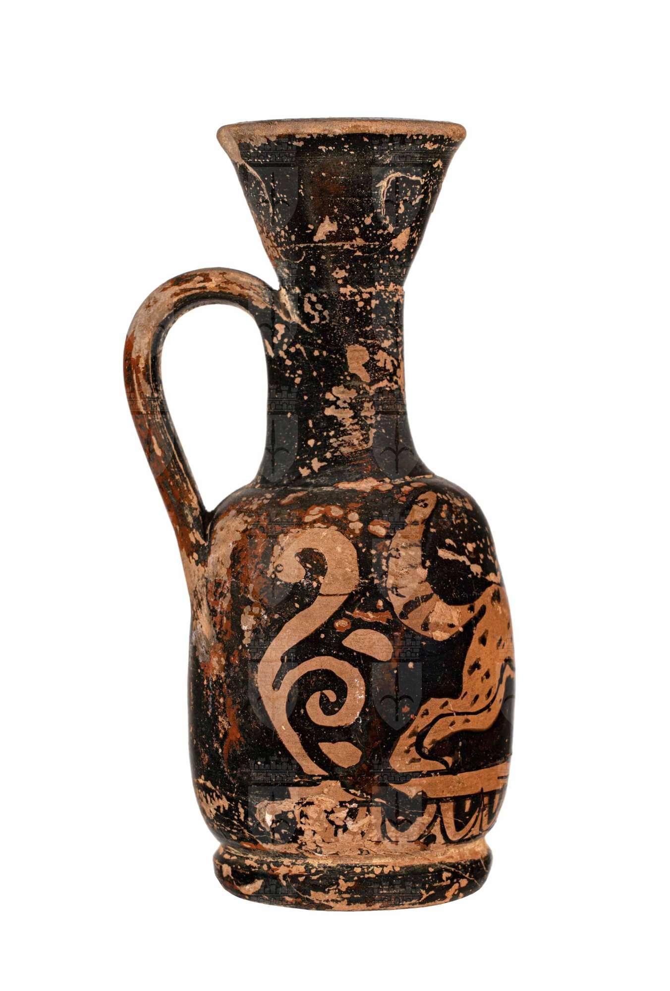 Lekythos attica a figure rosse, palmetta sotto l'ansa e felino in corsa.