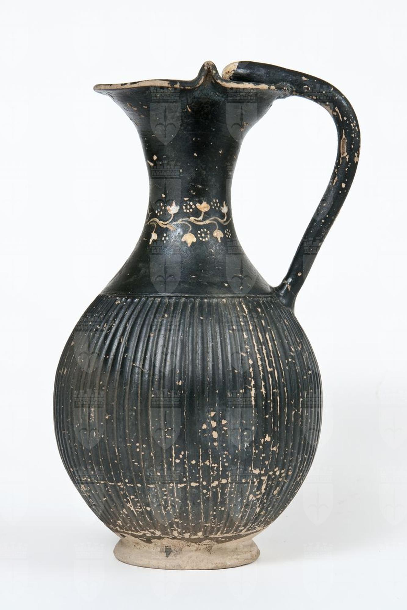 Oinochoe a vernice nera lucente, a tratti più chiara, con sovraddipinture in bianco e giallo. orlo estroflesso e trilobato, collo a profilo concavo, corpo globulare baccellato, ansa a bastoncello verticale desinente alla sommità, nel punto d’attacco all’orlo, in una protome di serpente, piede ad anello. Sul collo: tralcio di edera, con stelo sinuoso dipinto e rosette di punti in giallo; anche la protome presenta tracce di sovraddipinture in bianco e giallo.
