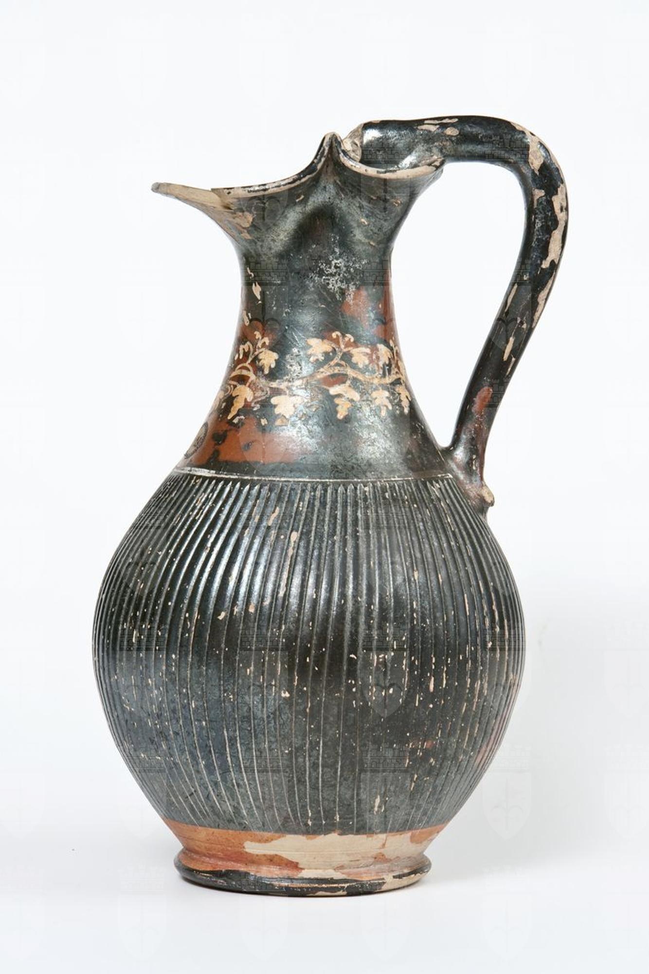 Oinochoe a vernice nera, tendente al rosso, con sovraddipinture in bianco e giallo. Orlo estroflesso e trilobato, collo a profilo concavo, corpo globulare strigilato, ansa a bastoncello leggermente obliqua e desinente alla sommità. nel punto d’attacco all’orlo, in una protome leonina, piede ad anello. Sul collo: tralcio di vite in giallo. Una linea dipinta in bianco, inquadra superiormente il corpo strigilato. Tracce di sovraddipintura sono presenti sulla protome leonina.