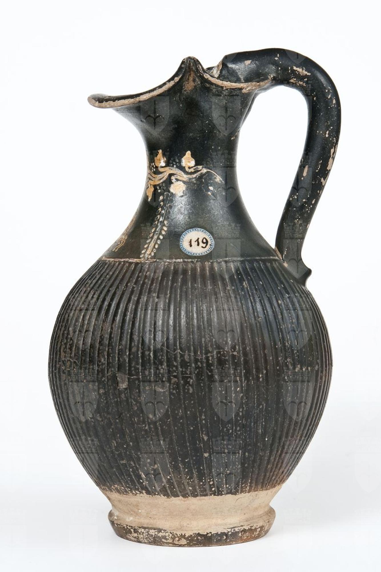 Oinochoe a vernice nera tendente al rosso, con sovraddipinture in bianco, giallo, rosso ed incisioni. Orlo estroflesso e trilobato, collo a profilo concavo, corpo globulare strigilato, ansa a bastoncello verticale leggermente sopraelevata e terminante in una protome leonina, presso l’attacco superiore, piede ad anello. Sul collo: tralcio di edera con stelo sinuoso dipinto ed inciso e rosette di punti in giallo su base bianca, da cui pendono due rami di alloro, che inquadrano una maschera pendente, a sua volta, dal tralcio. La maschera è di profilo verso sinistra, in bianco con dettagli incisi e campiti di giallo. La linea incisa, che delimita superiormente il corpo strigilato, è campita in rosso su base bianca. La protome leonina presenta tracce di sovraddipintura in giallo su base bianca.