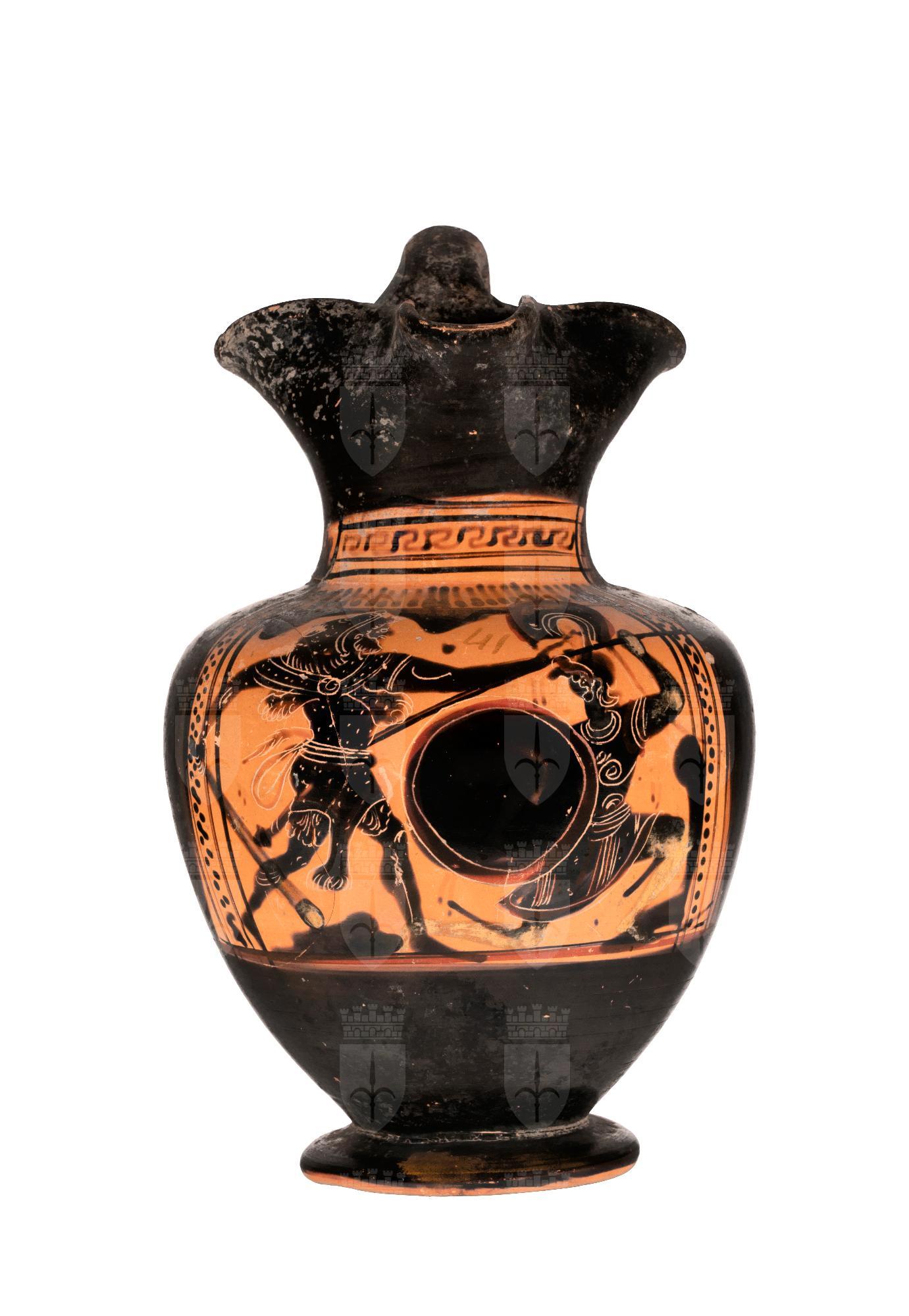 Oinochoe a figure nere con colori aggiunti e graffito: scena di Eracle che combatte contro una amazzone. Eracle, con indosso tunica, pelle di leone e schinieri, armato di clava aggredisce una amazzone, che piegata sul ginocchio sinistro, armata di elmo attico, corazza e schinieri, brandisce la lancia e uno scudo rotondo con al centro una gamba umana. Lo sfondo roccioso è reso a macchie indistinte.