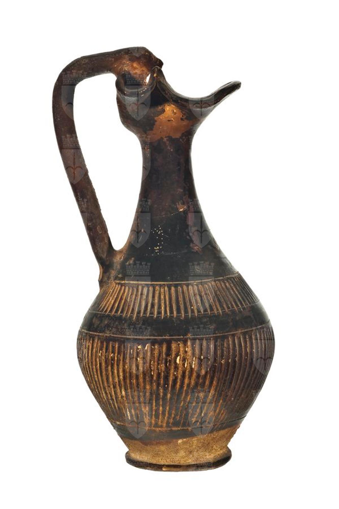 Oinochoe a vernice nera, tendente al rosso, sovraddipinture in rosso. Labbro modanato, orlo trilobato e estroflesso, stretto collo a profilo concavo, corpo globulare espanso particolarmente rastremato alle estremità, strigilato con fascia liscia tra le strigilature, ansa a bastoncello verticale leggermente sormontante e terminante a protome leonina, basso piede ad anello. Decorazione completamente evanida.