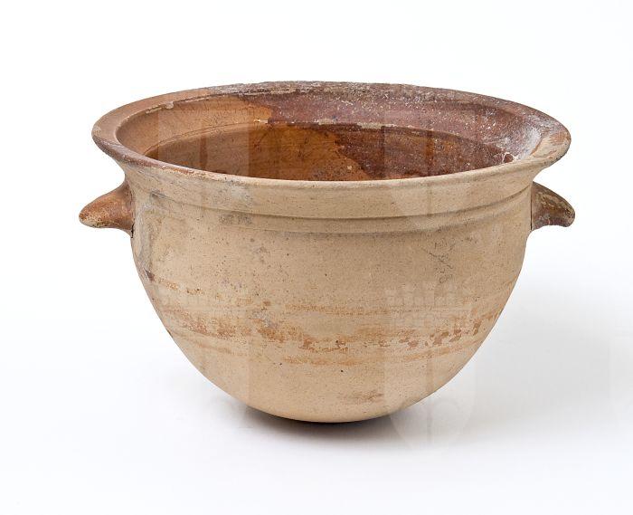 Olla con corpo globoso, rastremato sul fondo. Base piana priva di piede, con labbro svasato e orlo appiattito, distinto dal corpo con una risega, con prese laterali impostate orizzontalmente sotto l’orlo e rivolte verso il basso. Decorazione in vernice rossa diluita su fondo chiaro: sul corpo, fascia centrale più ampia, inquadrata in alto e in basso tra due fasce più sottili; dipinti l’orlo e le anse.