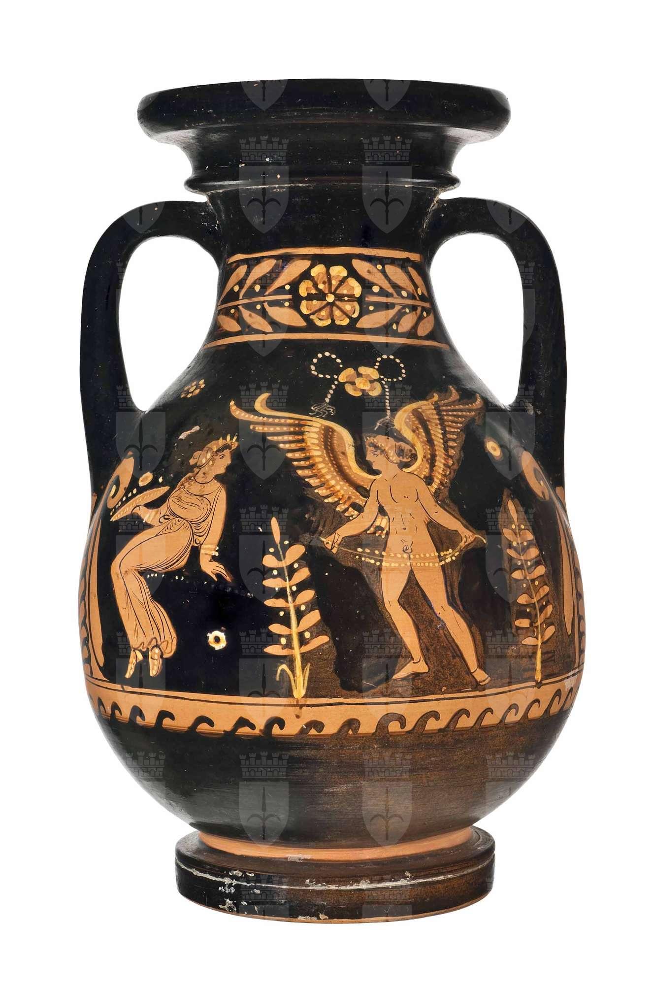 Pelike apulaa figure rosse. Lato A: donna seduta con patera con offerte ed Eros alato con serto (riccamente decorato). Lato B: due giovani ammantati con patera.