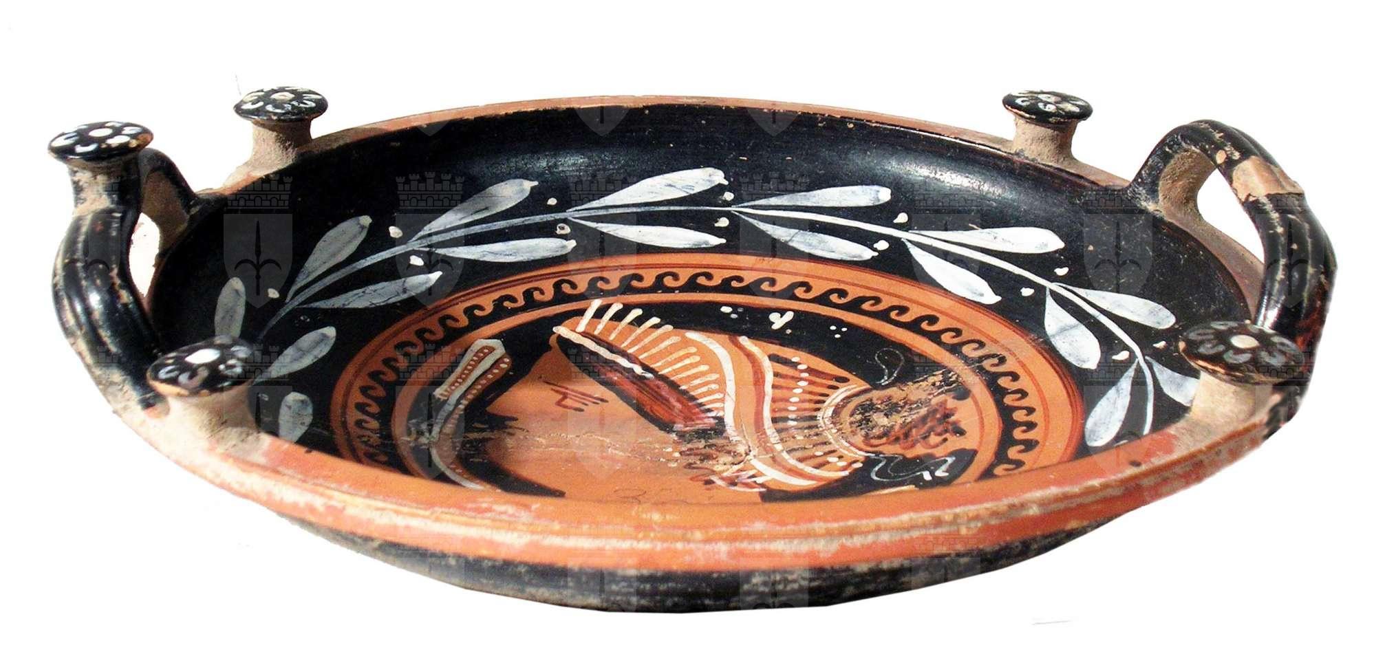 Phiale apula a figure rosse. Interno: testa femminile con mitella e dettagli in bianco all'interno di una fascia ad onda marina e ad un ramo d'alloro bianco.