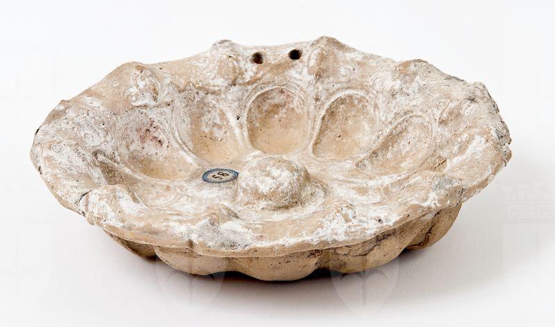 Phiale mesonfalica baccellata apula argentata. Bassa vasca emisferica, orlo ondulato ed estroflesso. All’interno, pomello rilevato al centro, baccellature concave profilate da un bordo incavato, tra le quali si dispongono, in corrispondenza dell’orlo, testine in rilievo; su un lato dell’orlo, due fori per la sospensione. La phiale presenta una spessa ingubbiatura biancastra di caolino a imitazione dei prototipi argentei.