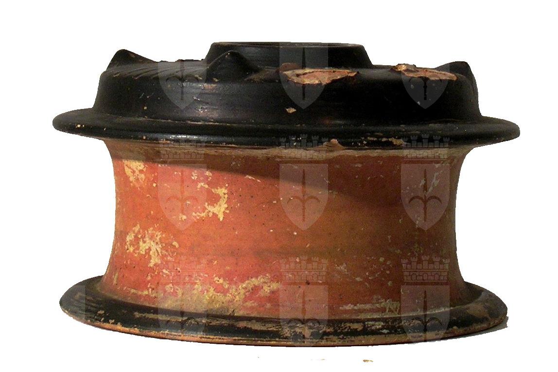 Pisside a vernice nera (ventre rosso) di forma circolare piatta con due alte anse riattaccate e 4 bugne, piede sporgente come la spalla