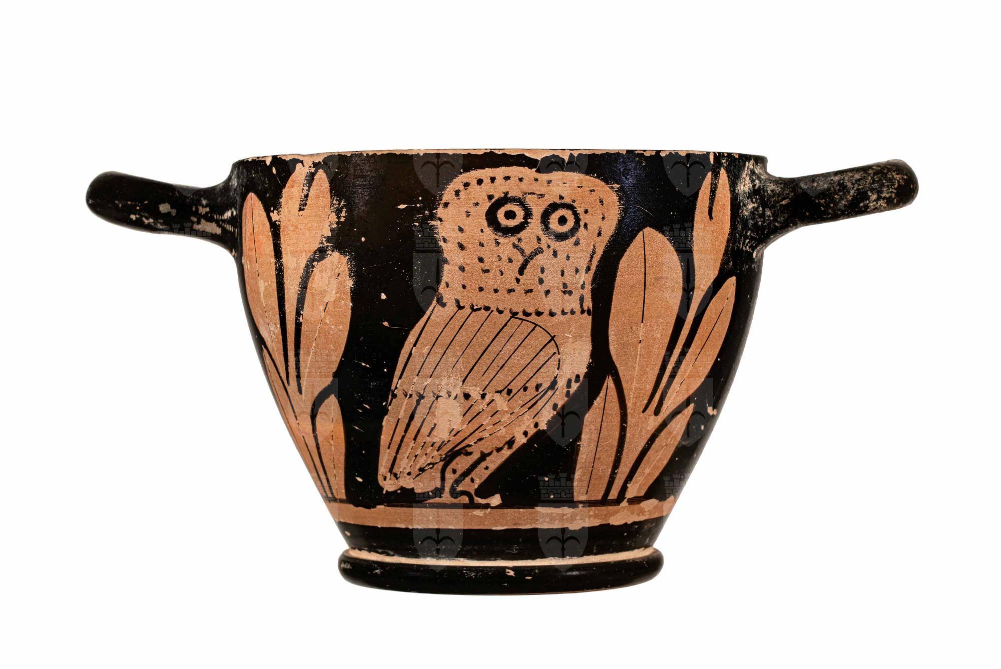 Skyphos glaux attico a figure rosse. Lato A e B: civetta tra alloro o olivo.