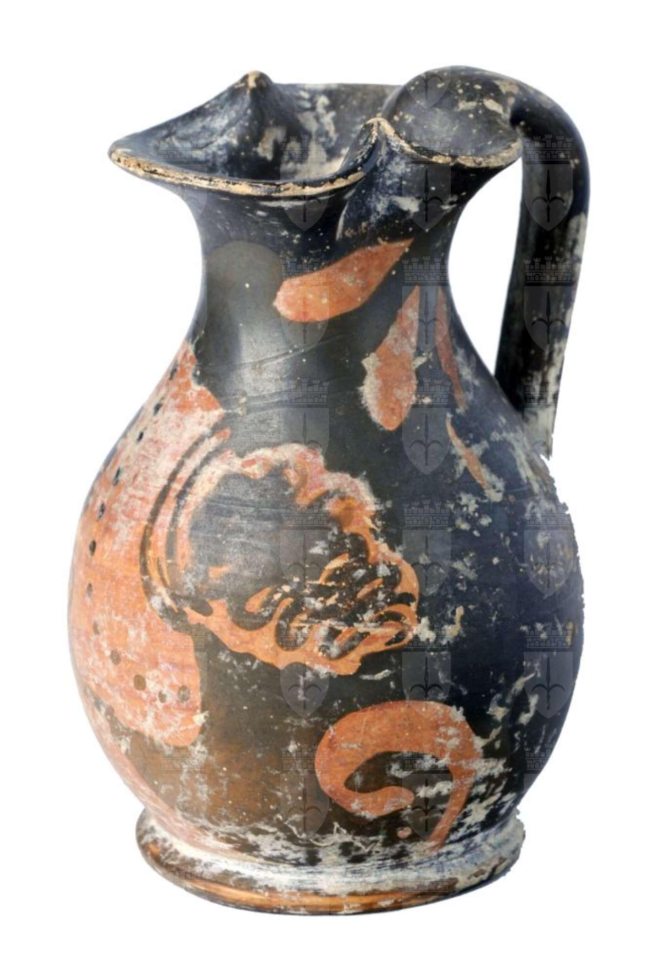 Oinochoe apula a figure rosse con piccola bocca tripartita con testa femminile.