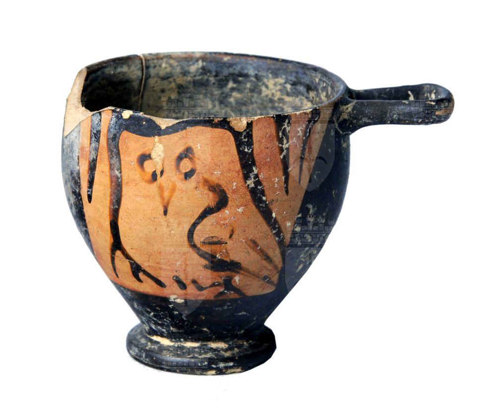 Skyphos apulo a figure rosse. Lato A e B: civetta tra foglie lanceolate.