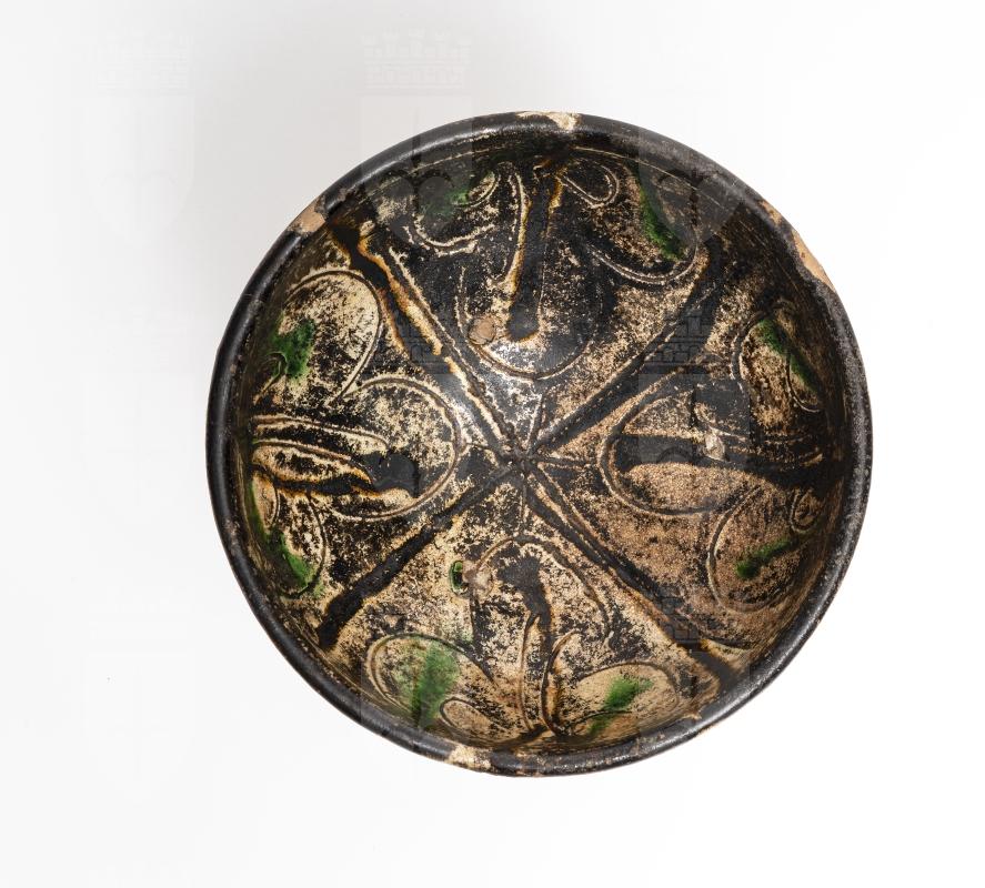 Ciotola emisferica con piccolo piede a tacco. Con all'interno decoro quadripartito inciso e dipinto in nero e verdea motivo vegetale con foglia centrale verticale e due laterali ricurve; all'esterno gocciolature sull'ingobbio chiaro che copre l'intera superficie.