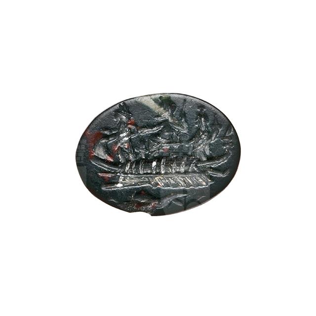 Gemma ovale, piana. Nave a remi sulla quale a poppa Fortuna con cornucopia a destra, nel mezzo una figura seduta a destra con la destra appoggiata allo scettro, nella sinistra protesta la patera, sopra l'aquila? A destra altra figura; sotto la nave delfini natanti a destra. Da Aquileia?