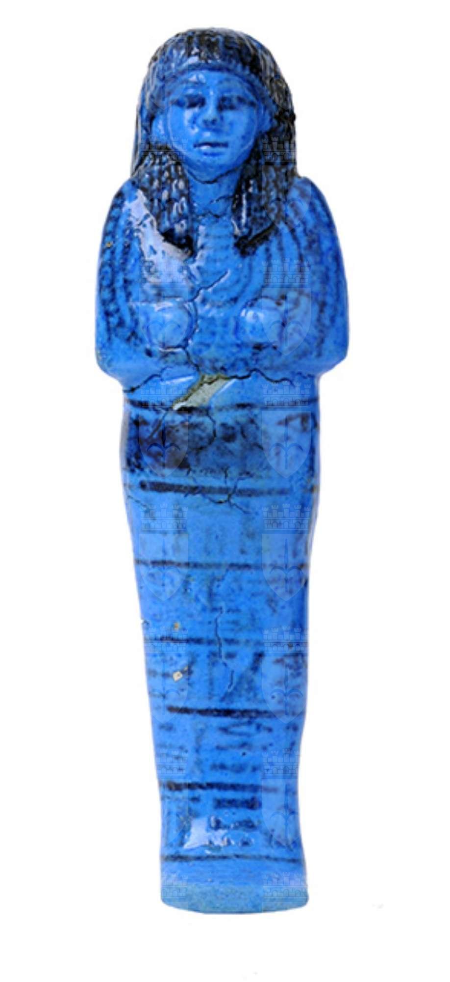 Statuina funeraria mummiforme che indossa un collare ed un’elaborata parrucca doppia. Le mani incrociate e affiancate sono senza attrezzi. Sulla schiena si vedono un bilanciere con due fiaschette ed un sacchetto che pende dalla spalla destra. Al centro, dietro le gambe, una decorazione con motivo a reticolo. Tutti i dettagli sono stati dipinti in nero, come anche l’iscrizione, che è disposta su sei righe. Benché poco leggibile, si riesce a capire che il testo è quello del capitolo 6 del Libro dei Morti. Da notare che nella prima riga il nome e i titoli del defunto sono stati cancellati con un rettangolo di inchiostro nero, mentre sopra la decorazione a reticolo dietro le gambe è stata aggiunta un’altra colonna di testo, purtroppo illeggibile, che forse riportava il nome di un nuovo proprietario.