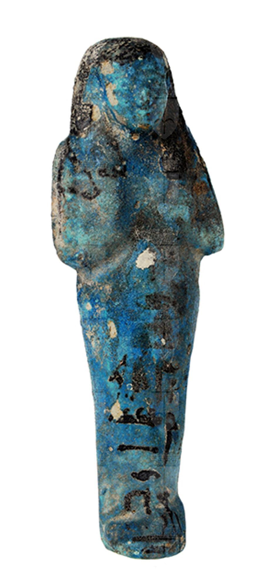 Statuina funeraria in faïence turchese dal colore molto acceso. L’iconografia è quella tipica: la statuina raffigura il defunto mummiforme, stante, con le braccia incrociate sul petto. La parrucca, le due zappe che tiene in mano e il sacco per le sementi sulla schiena sono resi in nero, come l’iscrizione che corre in colonna lungo la parte frontale del corpo.