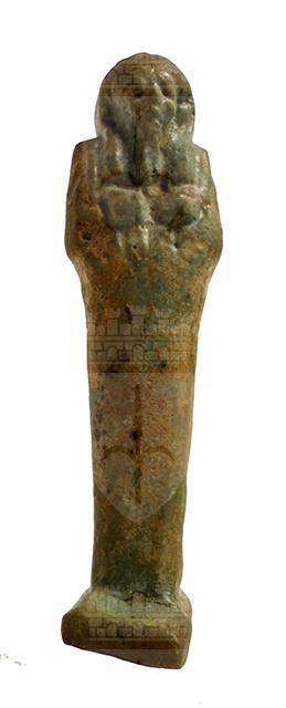 Statuina funeraria mummiforme che indossa una parrucca tripartita e la barba divina. Le mani incrociate ed affiancate portano ciascuna una zappa. Dalla spalla sinistra pende una sacca. Sono presenti base e pilastro dorsale, su cui vi è una colonna di testo, il quale risulta però completamente illeggibile.