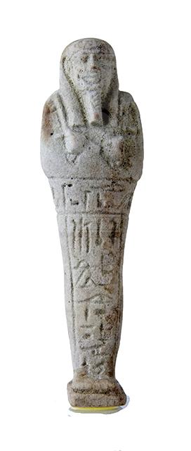 Statuina funeraria mummiforme che indossa una parrucca tripartita e la barba divina intrecciata. Le mani incrociate ed affiancate portano a destra una zappa e a sinistra un piccone. Dalla spalla sinistra pende una sacca. Il pilastro dorsale e la piccola base sono presenti. L’iscrizione, che si trova sul davanti dell’ushabti, è a forma di T con linee di contorno.