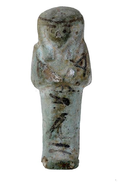 Statuina funeraria mummiforme che indossa una parrucca tripartita con seshed. Le mani incrociate tengono ciascuna una zappa. Al centro della schiena, una sacca sostenuta da due bretelle, è disegnata come se fosse di vimini intrecciati. Tutti i dettagli sono resi in nero. L’iscrizione corre lungo una colonna sul davanti delle gambe della statuina.