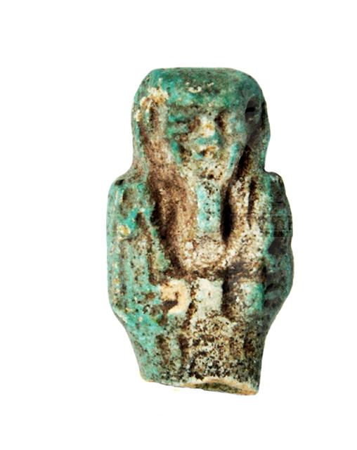 Frammento superiore di statuina funeraria mummiforme, che indossa la parrucca tripartita e la barba divina, le mani sono incrociate sul petto e reggono una zappa ciascuna. Per quanto si può vedere, sotto le mani comincia una colonna d'iscrizione geroglifica, purtroppo illeggibile.