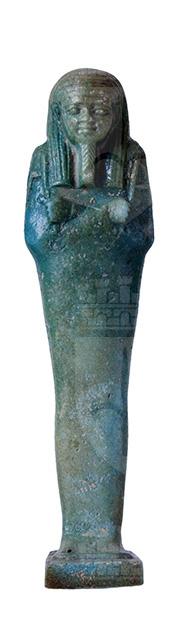 Statuina funeraria mummiforme che indossa una parrucca tripartita con fermagli e la barba divina intrecciata. Le mani incrociate, la destra sopra la sinistra, tengono rispettivamente una zappa e un piccone. Dalla spalla sinistra pende una sacca. I piedi poggiano su una piccola base. L’iscrizione corre lungo una colonna sul pilastro dorsale.